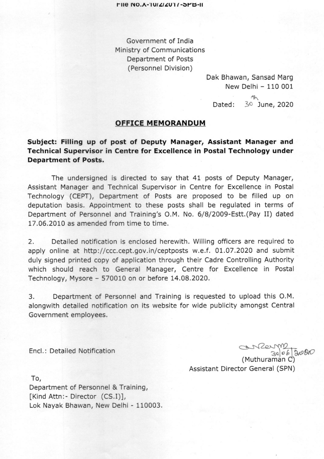 Filling up of post of Deputy Manager, Assistant Manager and Technical Supervisor in Centre for Excellence in Postal Technology under Department of Posts